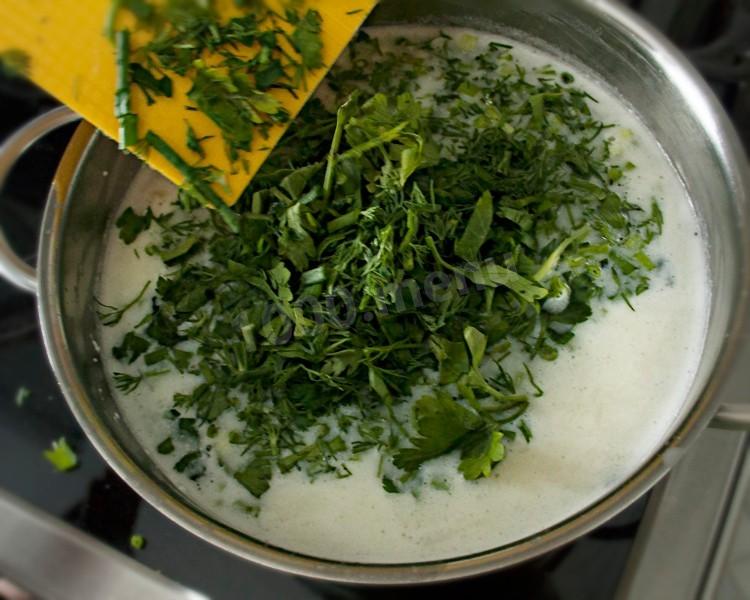 Затем засыпать всю зелень. Перемешать.