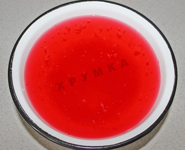 Готовим вишневое желе согласно инструкции на пачке. У меня пачка 100 г. Заливаем содержимое пачки водой 0,5 литра, перемешиваем, оставляем минут на 10, затем подогреваем до кипения, помешивая, чтобы желатин растворился. Затем тарелку ставим в холодную воду, чтобы желе остыло быстрее.