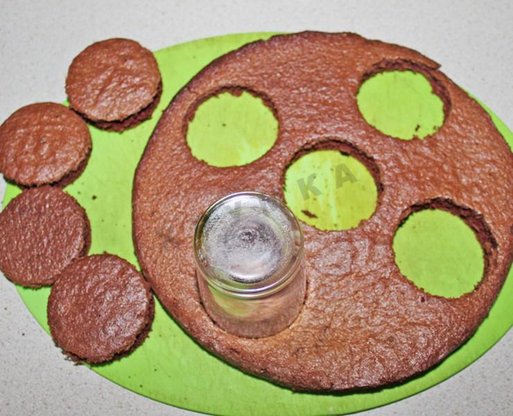 На темном бисквите вырезаем 5 кругов средним по размеру стаканом.
