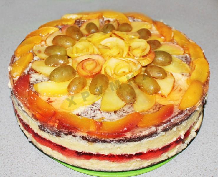 А с этой стороны в разрезе больше видны нектарин и желе. В любом случае, в разрезе торт смотрится очень интересно. Приятного аппетита! Если торт весь сразу не съели, ставьте в холодильник, так как крем-пудинг станет в тепле мягче и будет съезжать со слоя желе.