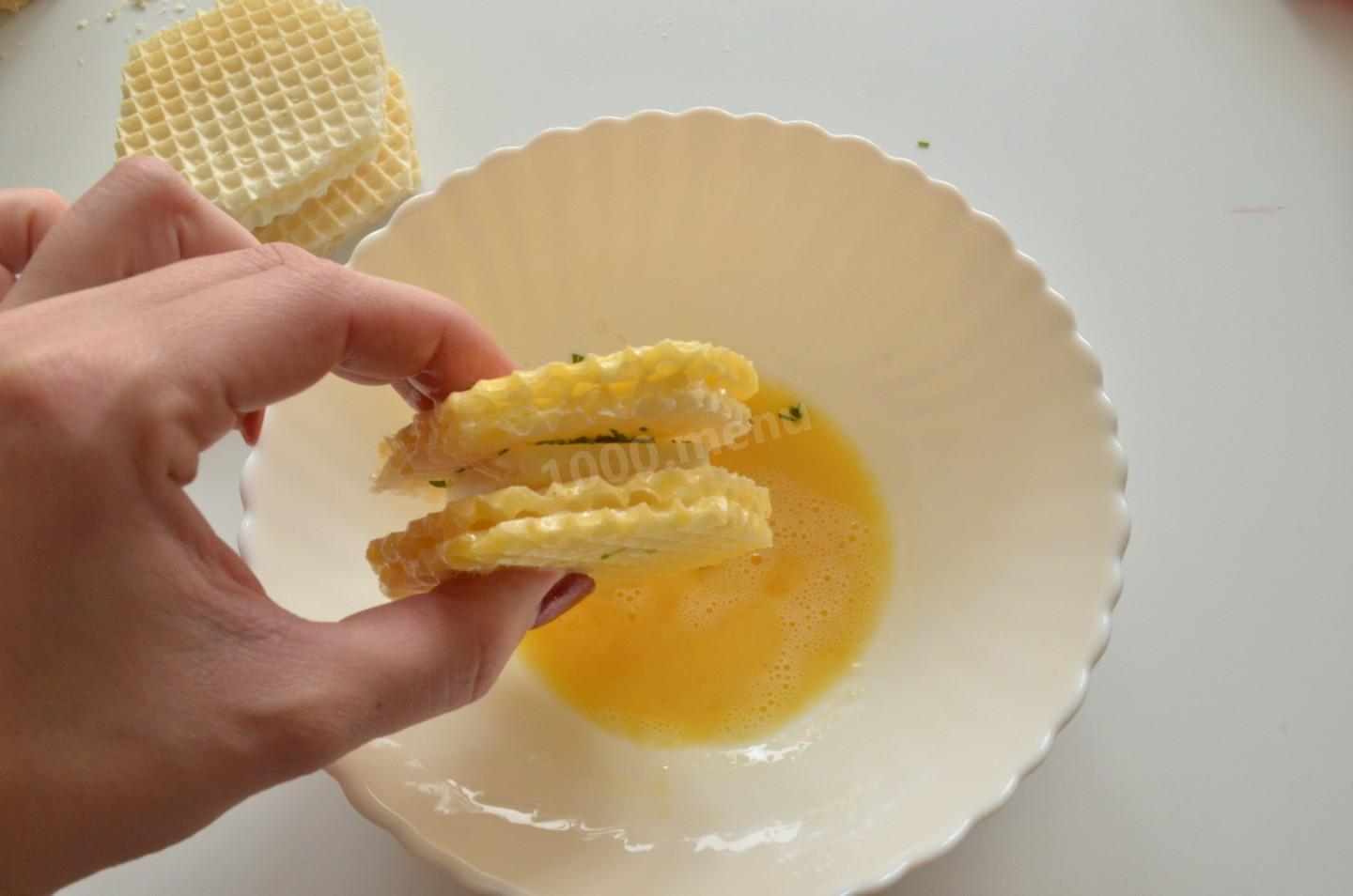 Заготовку аккуратно обмакнуть в яйцо с двух сторон.