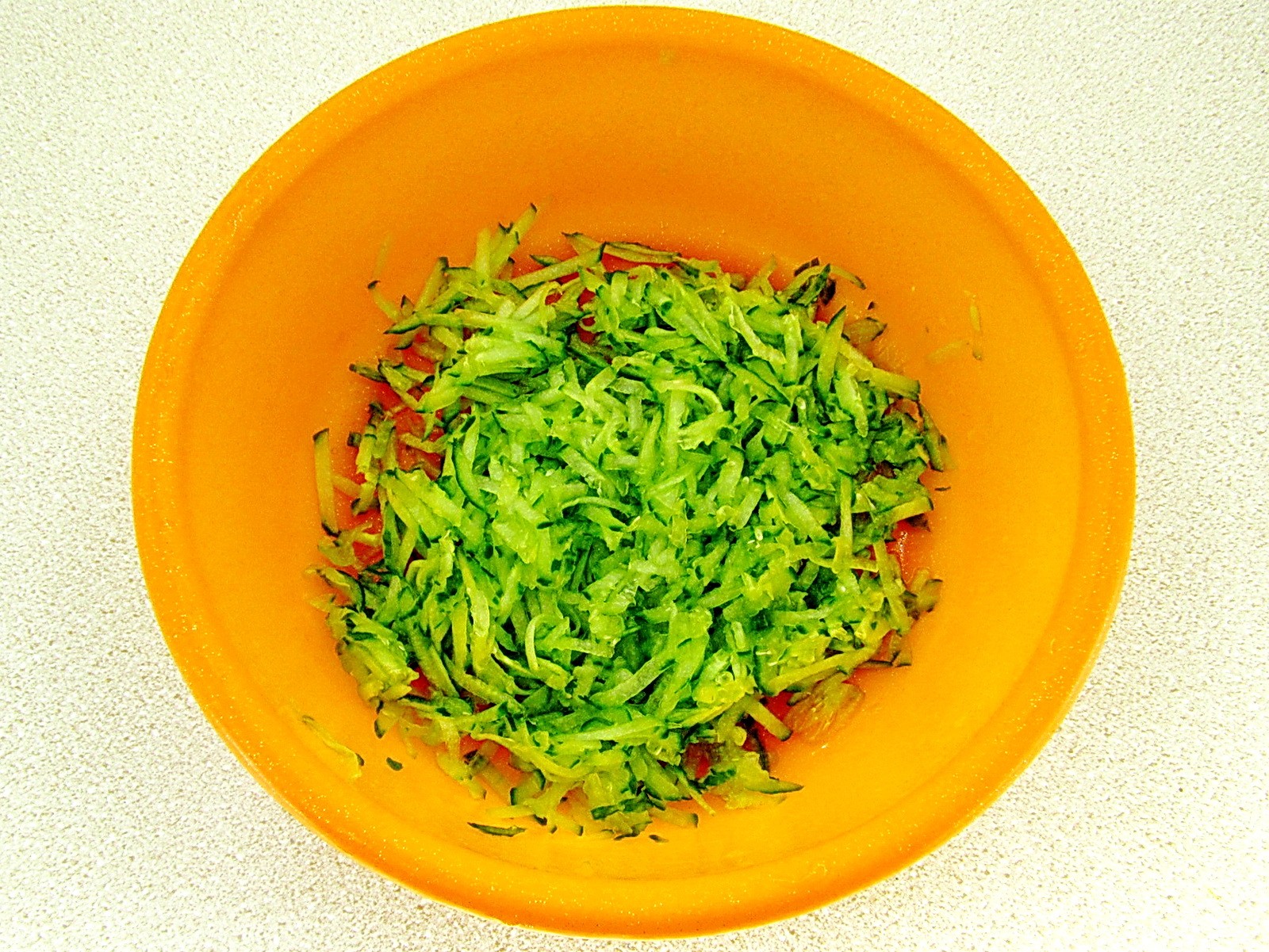 Огурец вымыть и натереть на крупной тёрке вместе с кожурой. Если кожица грубая, то лучше её снять.