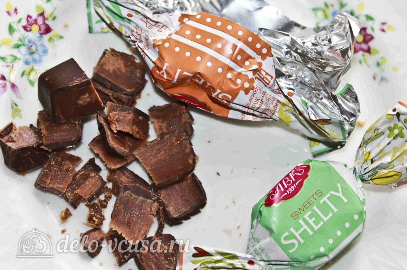 Шоколадку или шоколадные конфеты нарезаем на кусочки или превращаем в стружку (по желанию).