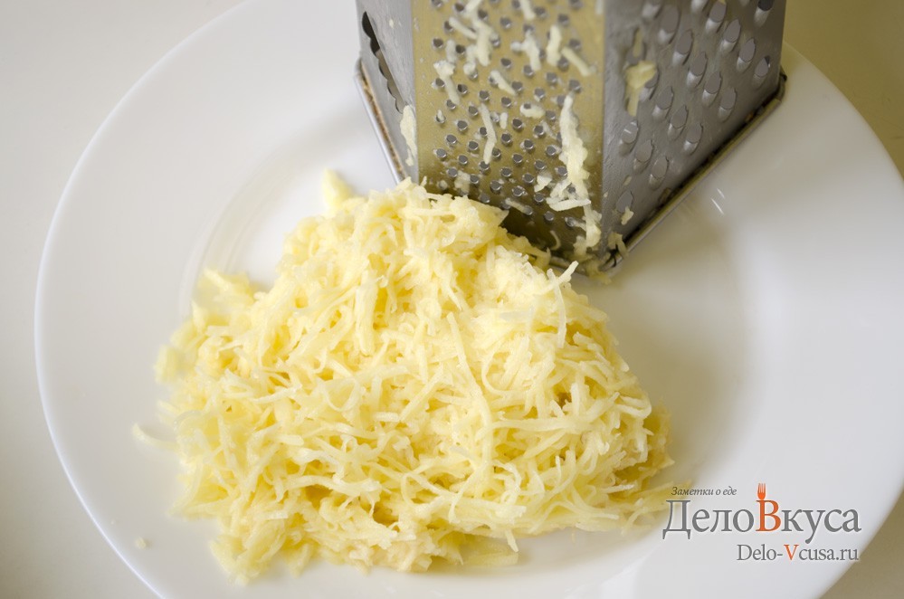 - Первый способ - просто натереть картошку на терке, но тут важно сначала натереть лук, а уже потом приступить к картошке. Картошку нужно натирать небольшими порциями и сразу смешивать с луком, благодаря этому она не почернеет. Традиционно картошку натирают на самой мелкой терке, но я очень часто для этих целей использую среднею терку. Если у вас дома есть кухонный комбайн, то для удобства можно воспользоваться им.