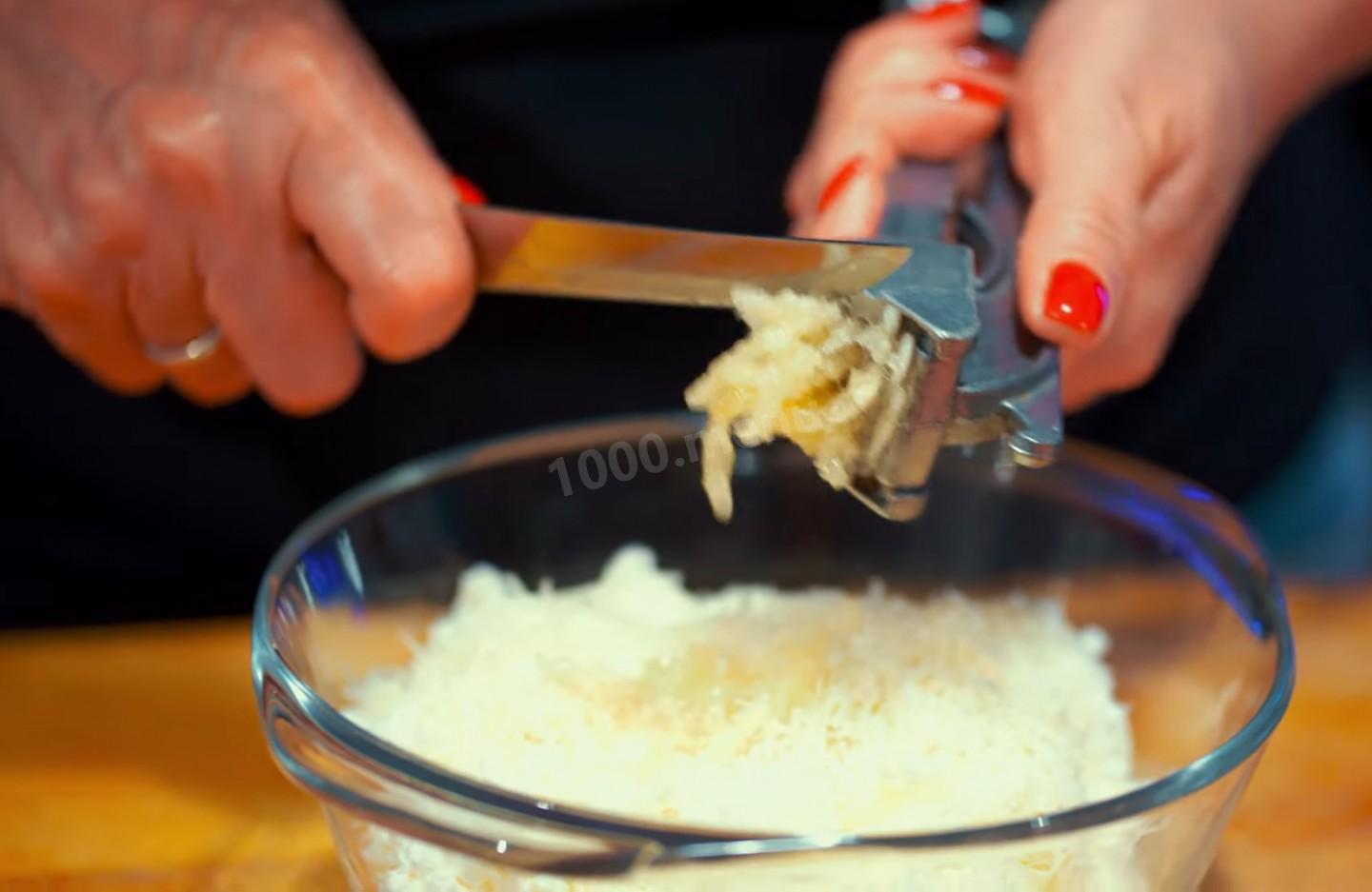 Добавляем в миску с творогом и сыром пропущенные через пресс три зубчика чеснока.