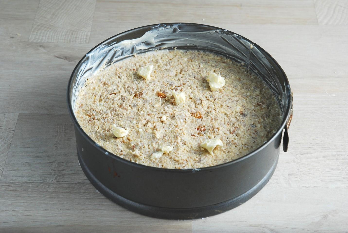 Возьмите круглую форму 18-20 см в диаметре. Дно формы застелите качественной бумагой для выпечки. Смажьте дно и бока ломтиком сливочного масла.