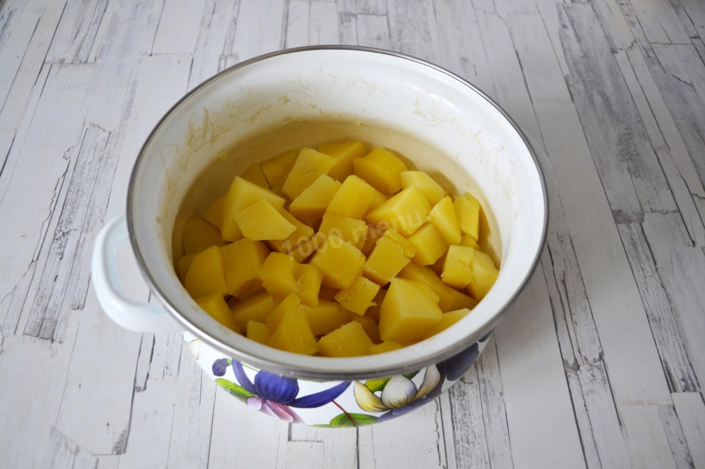 Поставьте кастрюлю на огонь и доведите воду до кипения. Варите картофель на небольшом огне около 30 минут, проверяя готовность ножом — он должен легко проткнуть кусочки. Время варки будет зависеть от сорта и величины клубней. Молоко вскипятите.