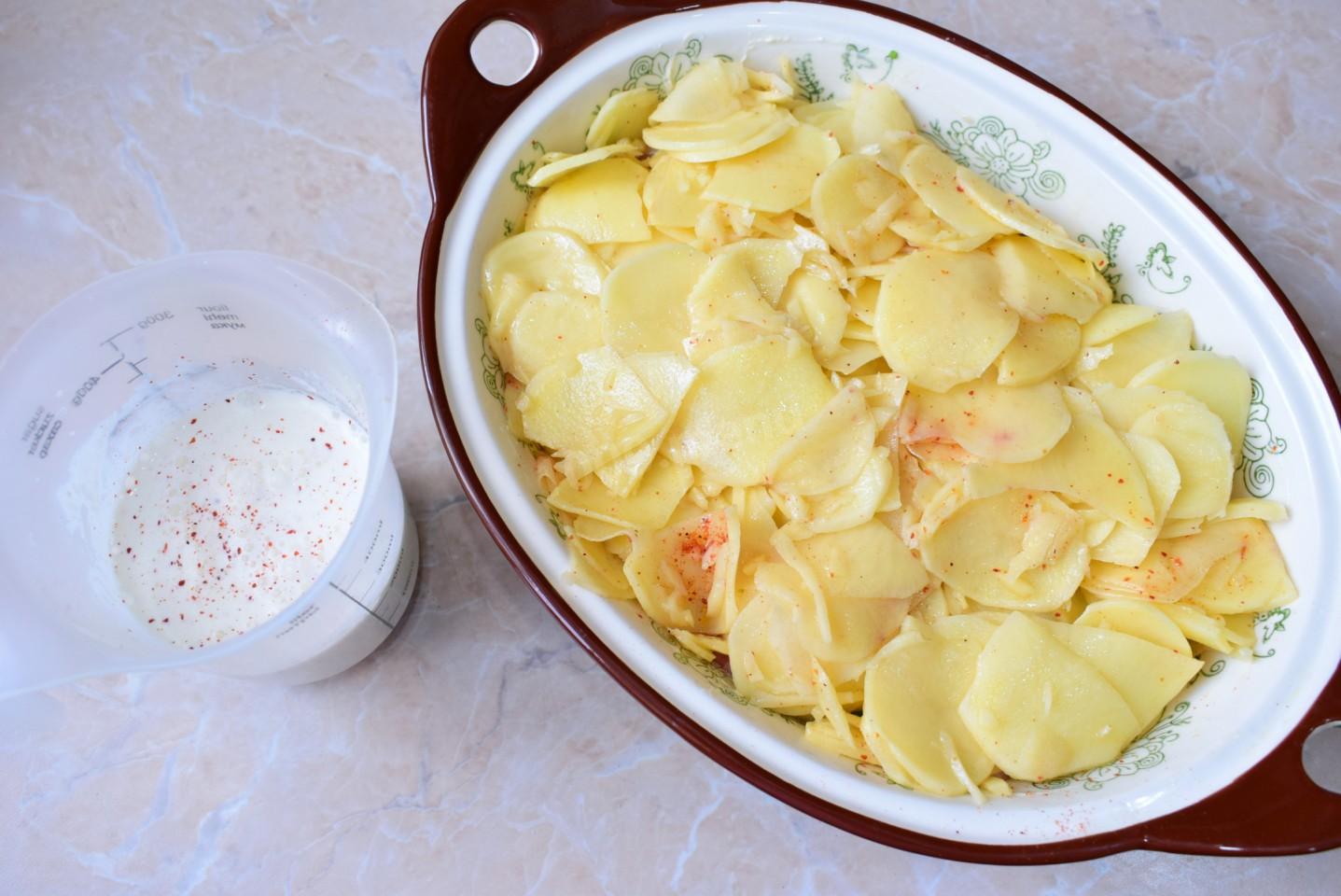 Разложите картофель по всей поверхности мяса. Подготовленные сливки немного подсолите и поперчите. Полейте ими картофель. Сливки придадут вкусу готового блюда сливочный вкус и свяжут все ингредиенты между собой.