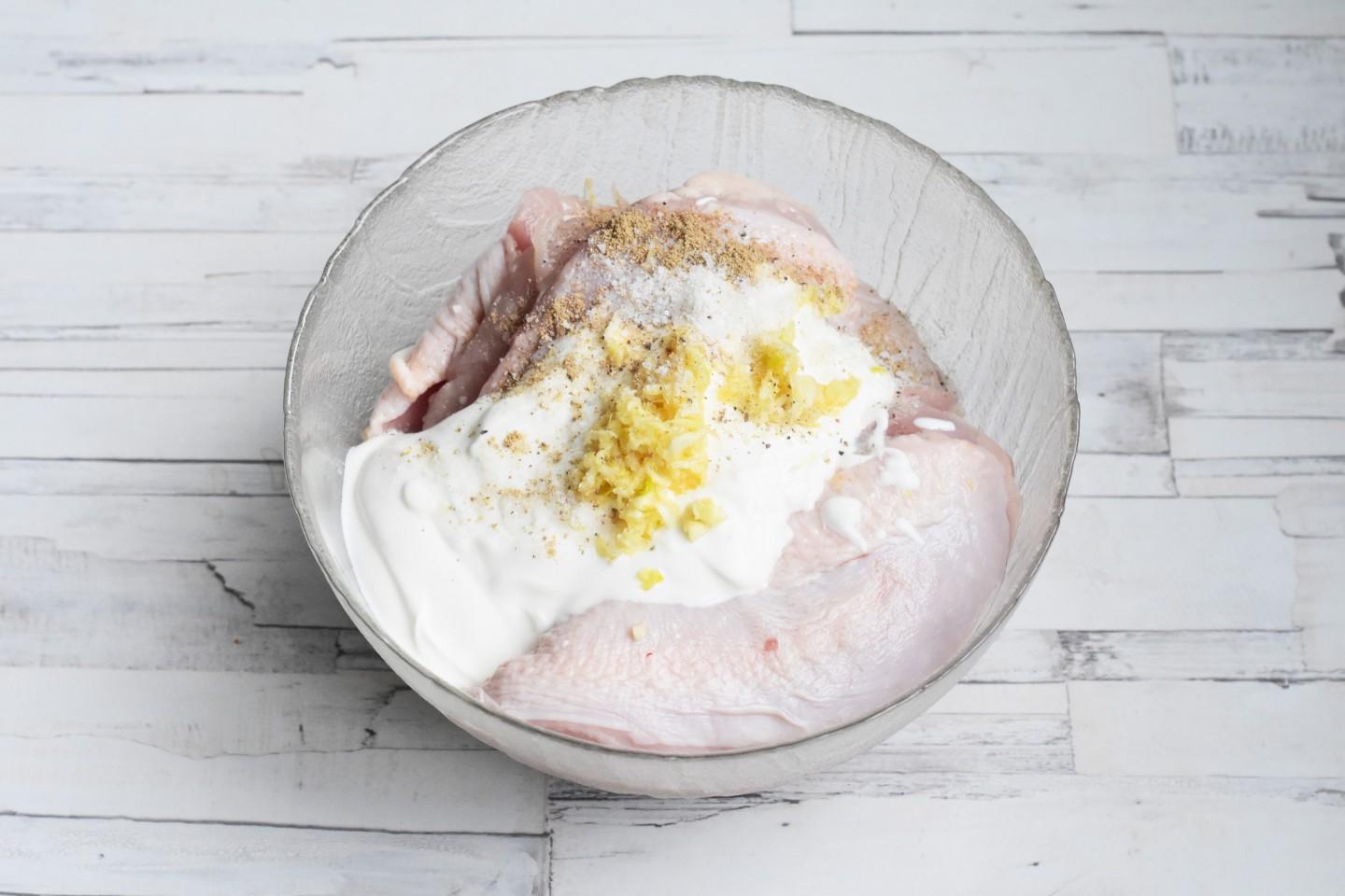 Хорошо перемешайте. Курица должна быть полностью покрыта сметанно-чесночной смесью. Оставьте мариноваться 30 минут или дольше, как позволяет время.