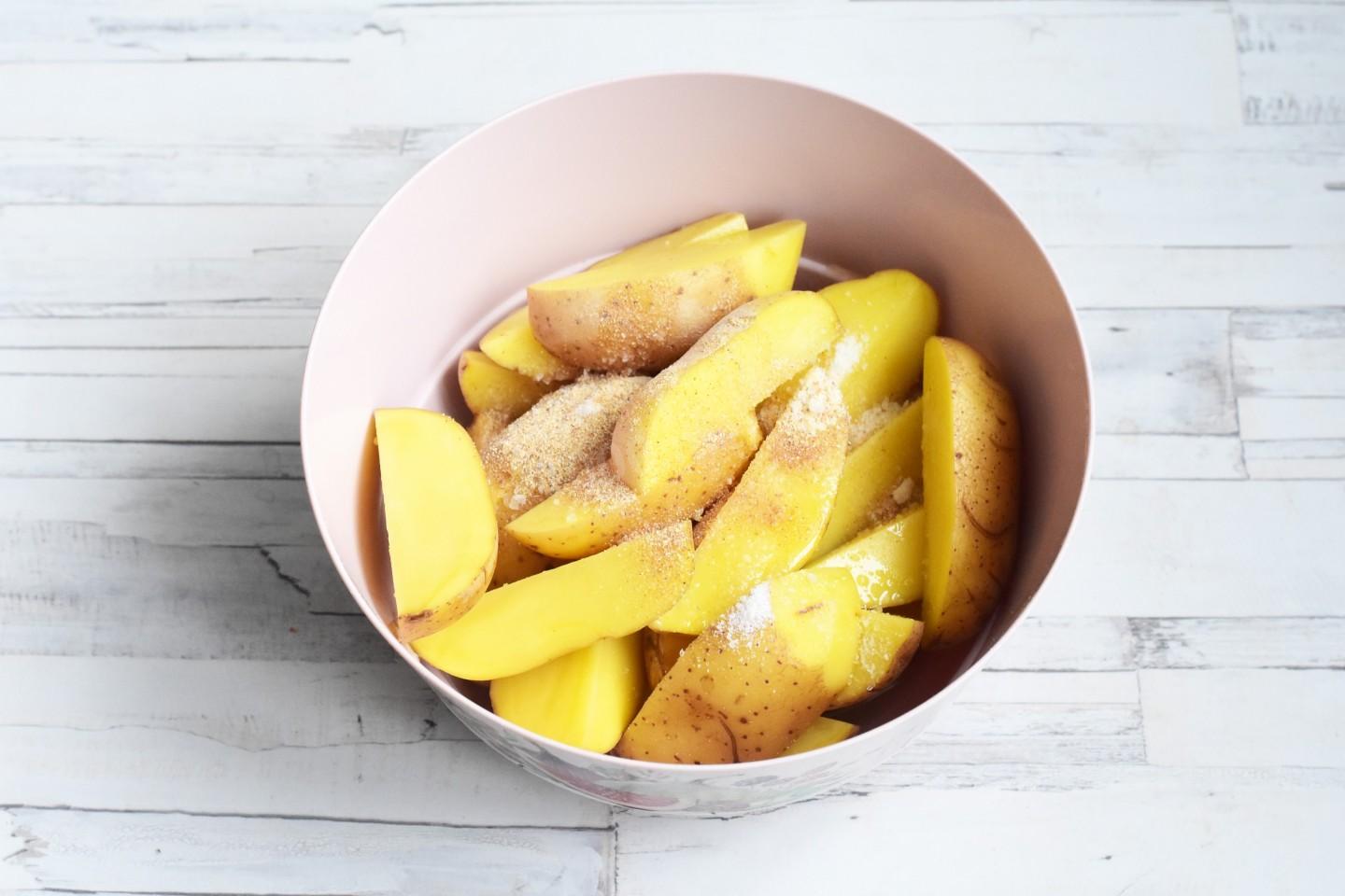 Выложите картофель в миску, влейте растительное масло, всыпьте сухой чеснок и соль. Тщательно перемешайте.
