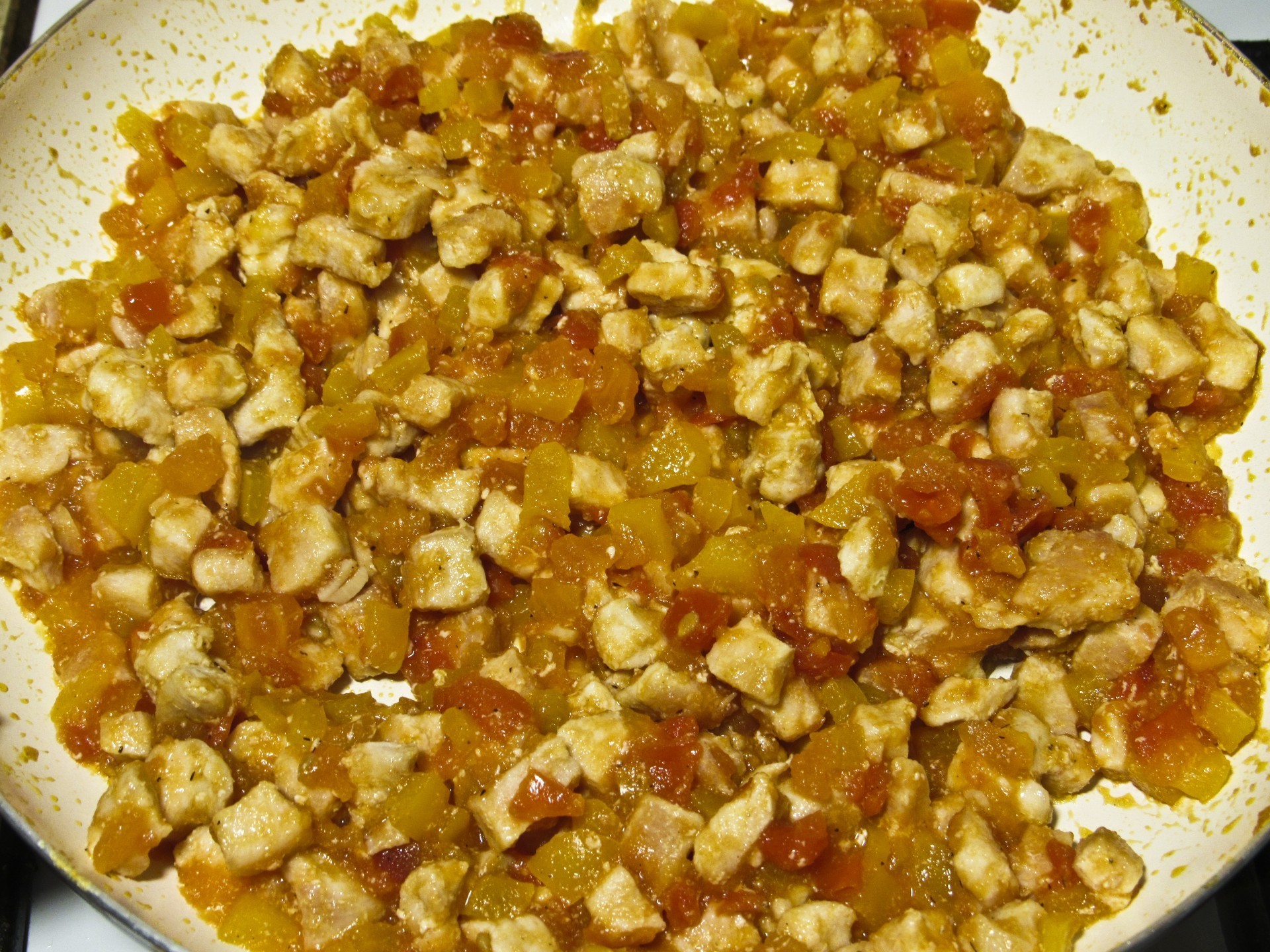 Готовое филе курицы и соус соединяем в одной сковороде.