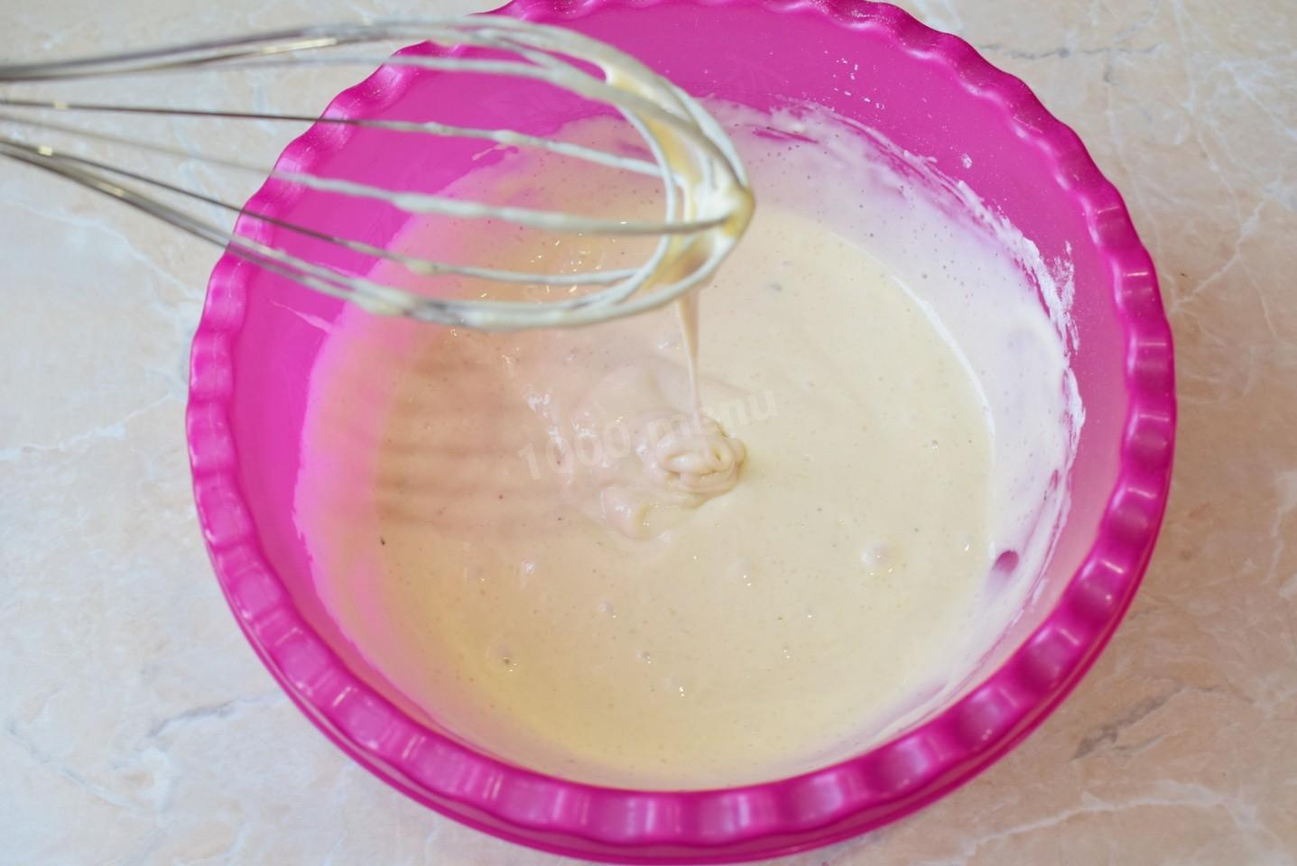Готовое тесто получается не жидкое и не густое. Оно оставляет следы, но потом, все же, сливается в общую массу.