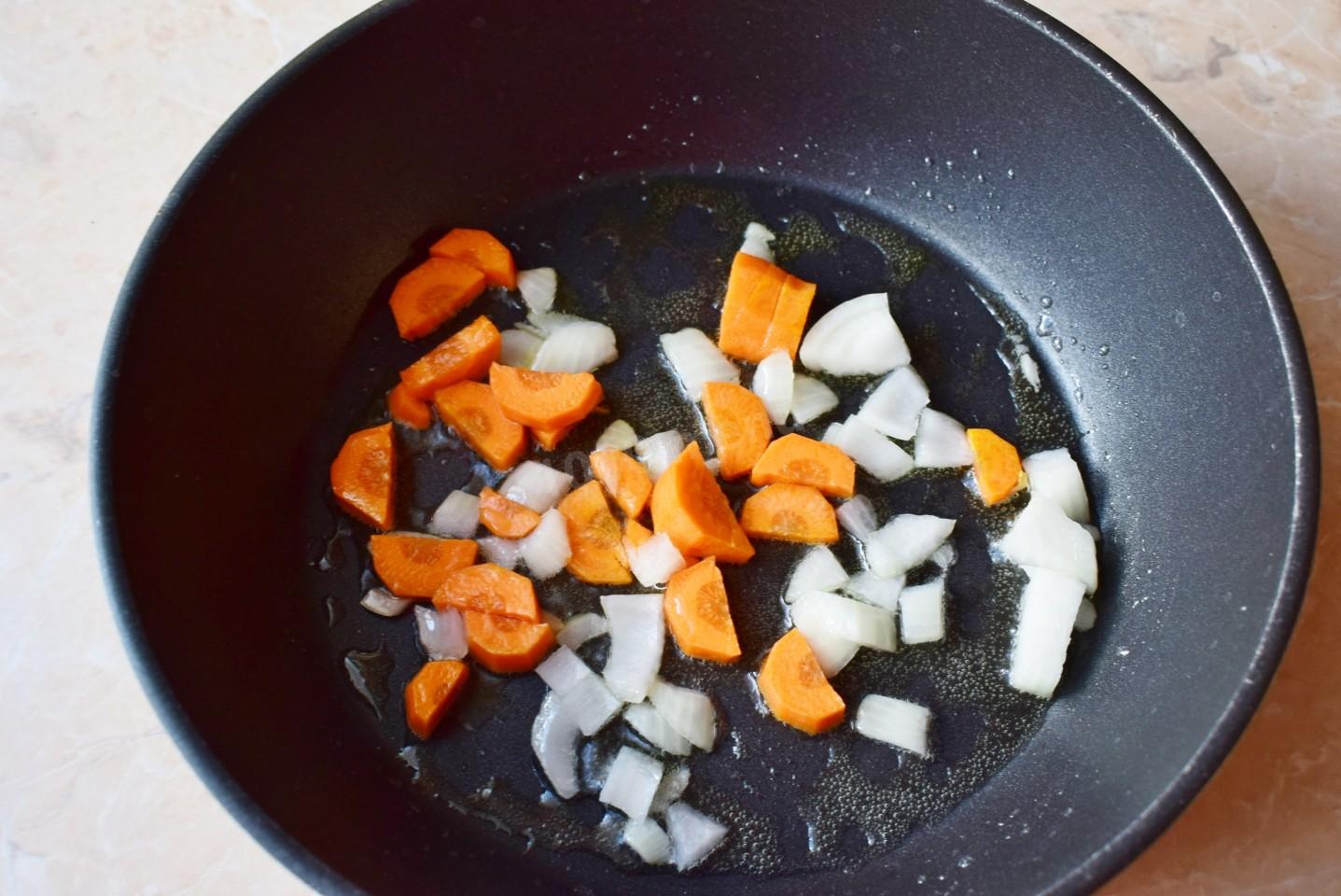 Шаг 3 приготовления Крем суп из красной чечевицы На горячую сковороду налейте немного растительного масла. Нарежьте лук и морковь и обжарьте их пару минут.