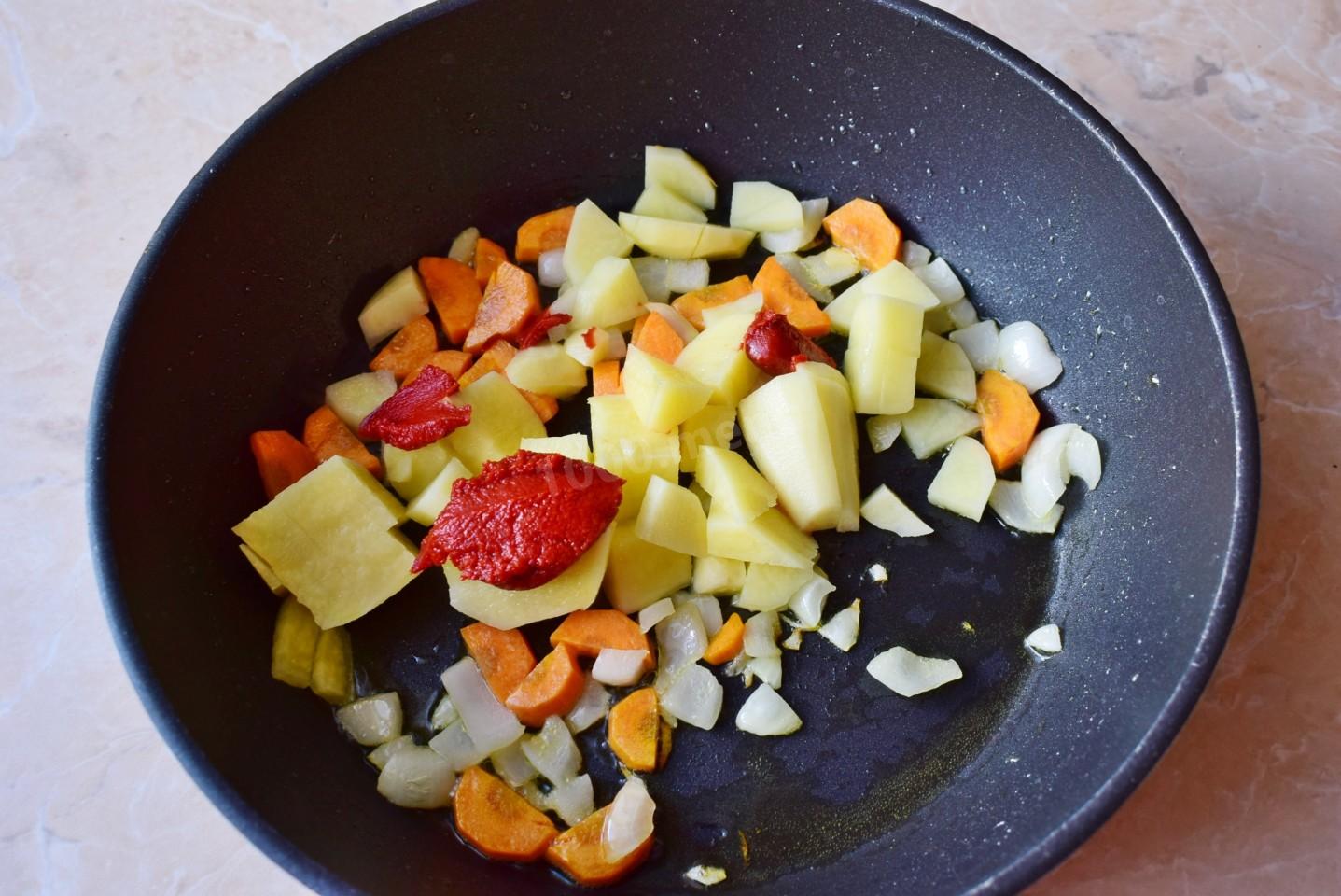 Шаг 4 приготовления Крем суп из красной чечевицы Затем добавьте в сковороду нарезанный картофель и томатную пасту. Перемешайте и обжарьте все вместе еще 2-4 минуты. Нарезать овощи можно любого размера, так как потом будем все измельчать.