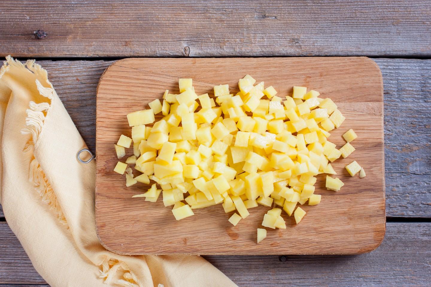 Картофель вымойте с щеткой под проточной водой, очистите от кожуры, нарежьте маленькими кубиками и отправьте в суп. Варите еще 15-20 минут после закипания.