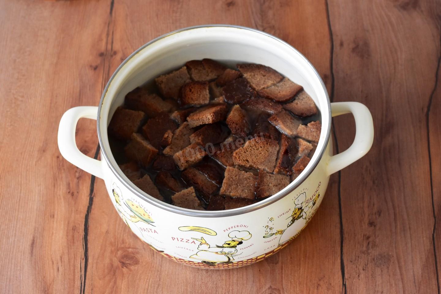 Размоченные сухари верните в первую кастрюлю снова залейте 1 л горячей кипяченой воды. Также оставьте на 1,5 часа. Так весь вкус и аромат из сухарей уйдет в воду.