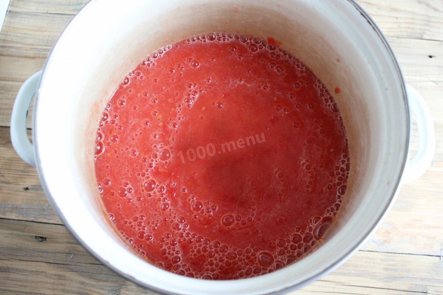 Помидоры перекрутите на мясорубке или пробейте блендером. Томатное пюре перелейте в эмалированную кастрюлю (посуду лучше использовать с толстым дном или антипригарным покрытием, кастрюлю или сотейник) и поставьте на огонь. Варите томатный сок в течение 20 минут с момента закипания на среднем огне. Очень важно периодически перемешивать овощную смесь, поднимая ее со дна кастрюли, чтобы она не начала прилипать и пригорать.
