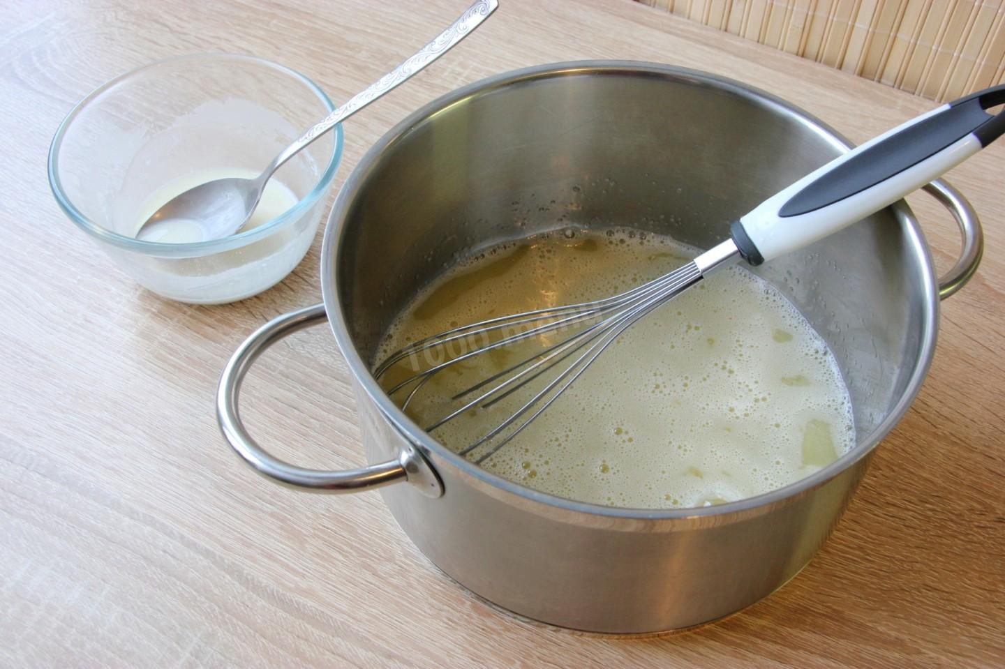 Пока сок на плите, яйца разбейте в кастрюльку с толстым дном. Слегка взбейте, постепенно введите оставшийся сахар и разведённый крахмал, перемешайте.