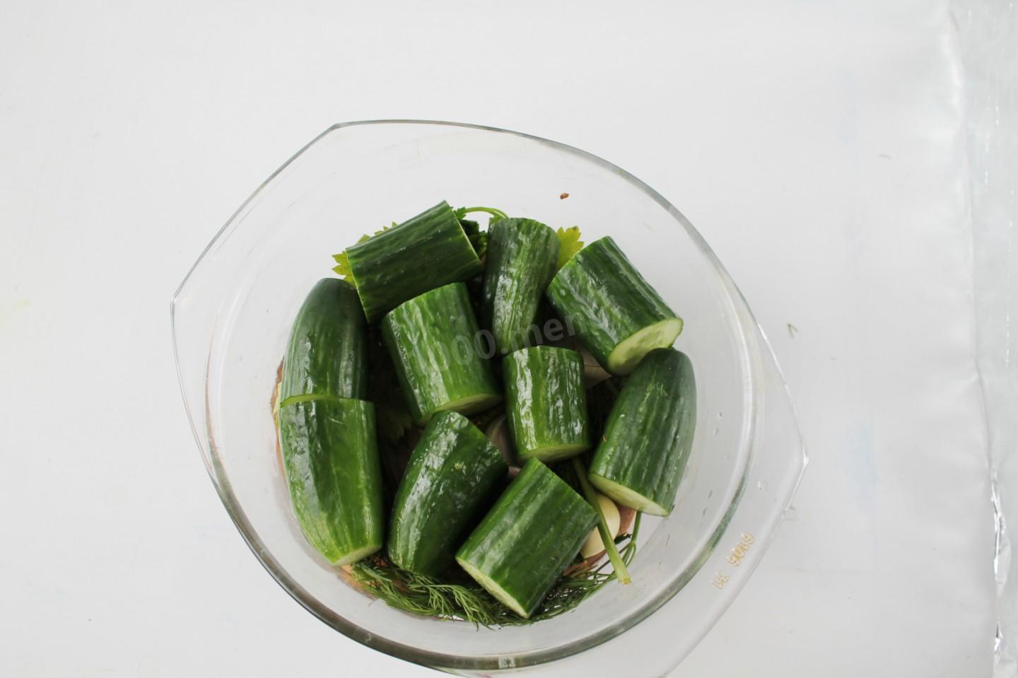 Выложите нарезанные бочонками огурцы. Чем мельче нарезка, тем быстрее огурцы будут готовы. Но мелко нарезайте ту часть огурцов, которую планируете съесть буквально через 2-3 часа. Остальные покрупнее - как на фото - они будут готовы на следующий день.