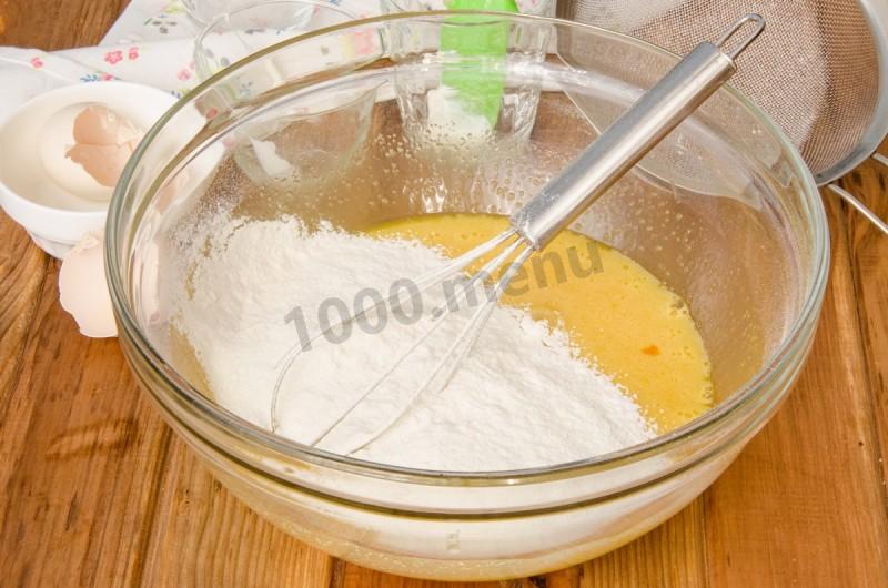 Муку просейте через сито или с помощью специальной кружки. Это насытит ее кислородом и сделает выпечку более воздушной. Добавьте муку в миску и замесите тесто. Можно начать замес венчиком, пока это удобно. Далее взять ложку.