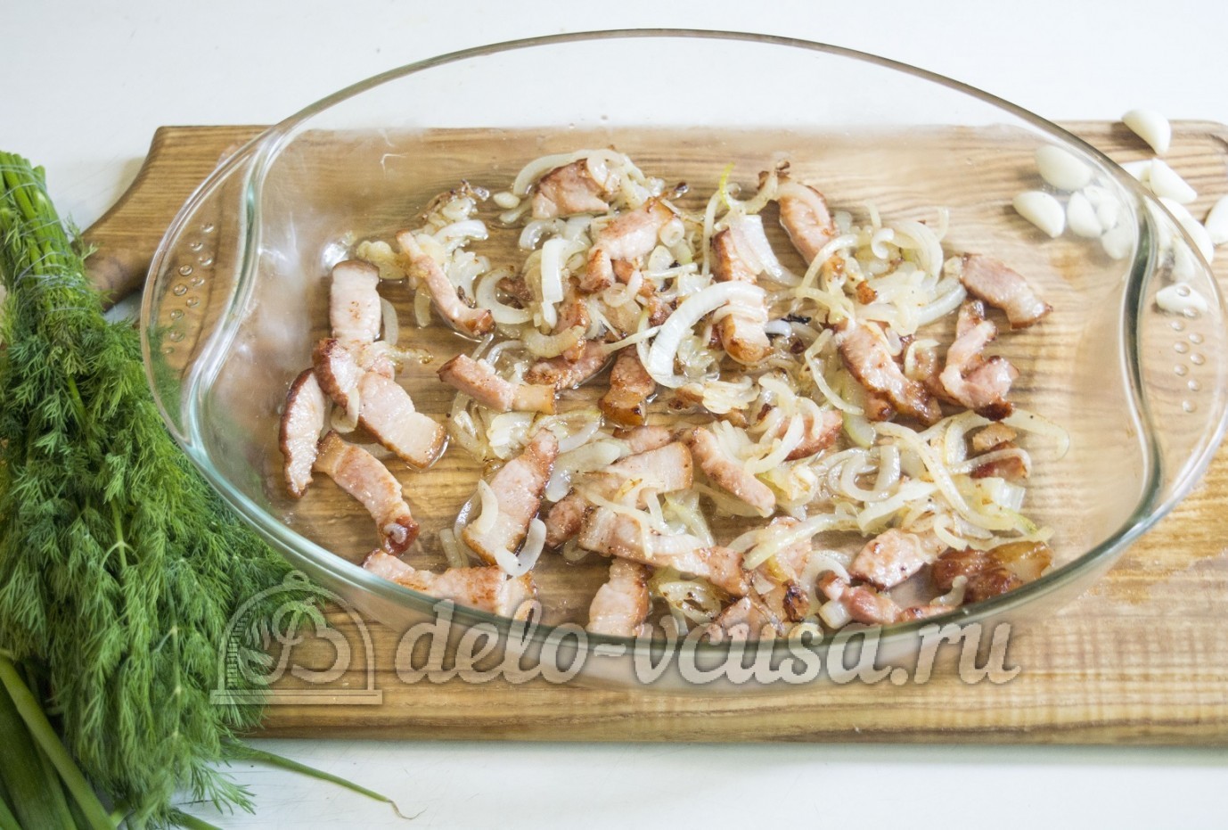 В форму, подходящую для запекания в духовке, уложить лук с грудинкой. Постарайтесь большую часть жира оставить в сковородке.