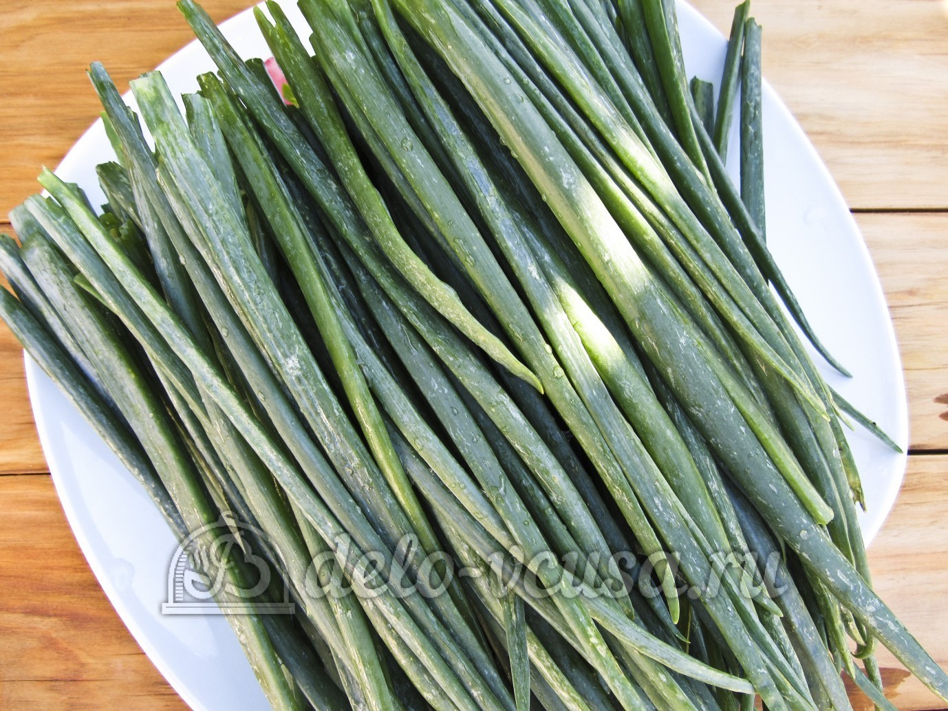Лук перебираем, удаляем поврежденные перья, моем в поточной прохладной воде. Лишнюю жидкость обсушиваем бумажным полотенцем.