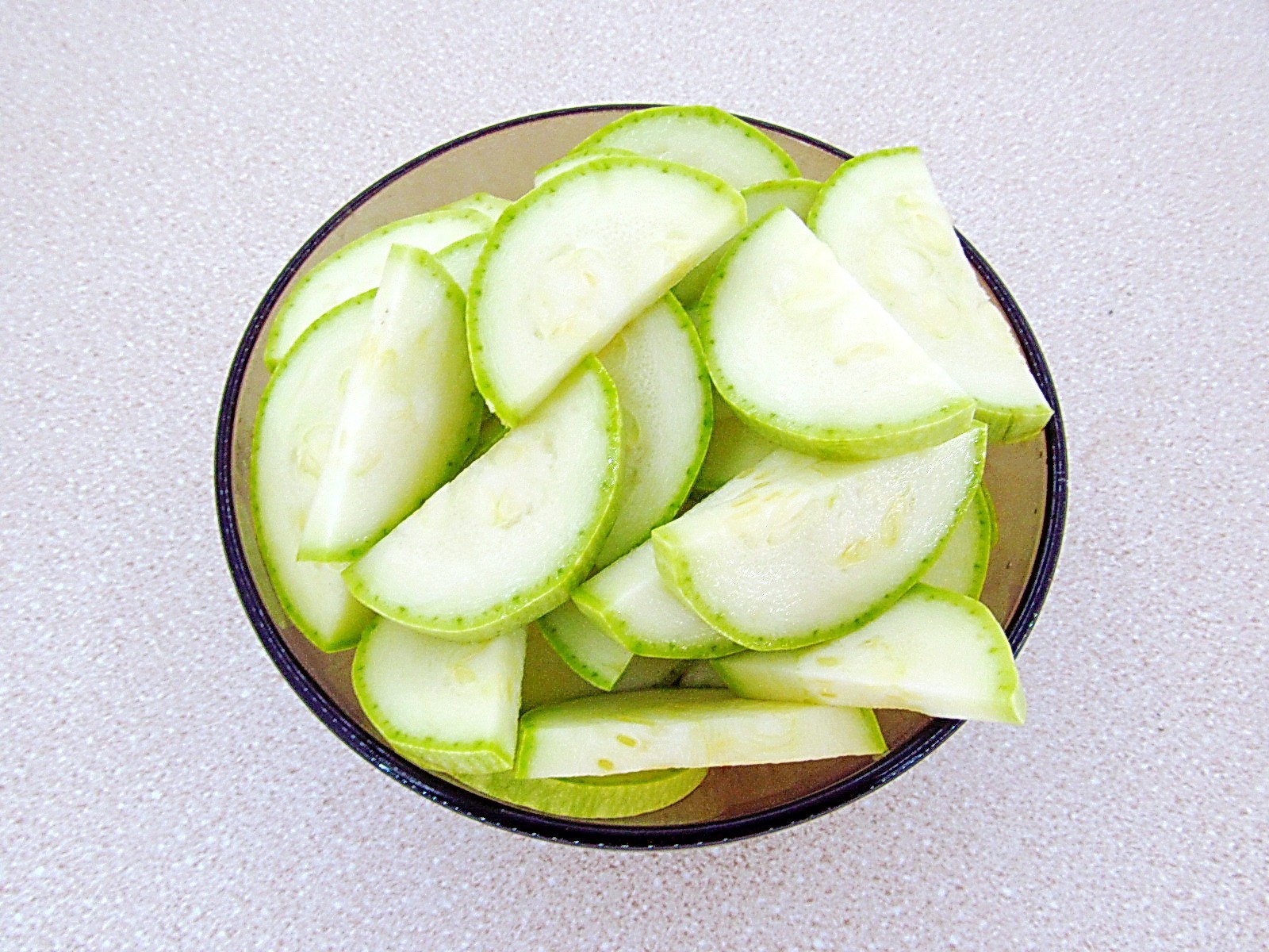 Кабачки вымыть и нарезать тонкими кружочками, крупные кружки разрезать пополам.