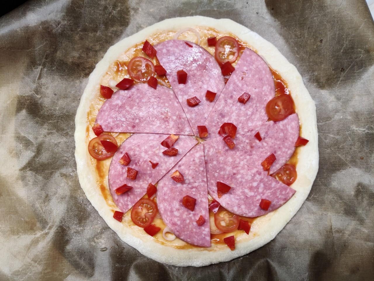 Лук очистите и нарежьте тонкими кольцами. Колбасу нарежьте тонкими ломтиками. Сладкий болгарский перец вымойте, удалите у него семена и мелко нарежьте. Помидоры черри вымойте и нарежьте колечками. Все подготовленные ингредиенты распределите на основе. Очерёдность не влияет на вкус. Но мне показалось, что будет красиво в таком порядке: лук, колбаса, помидоры и болгарский перец.