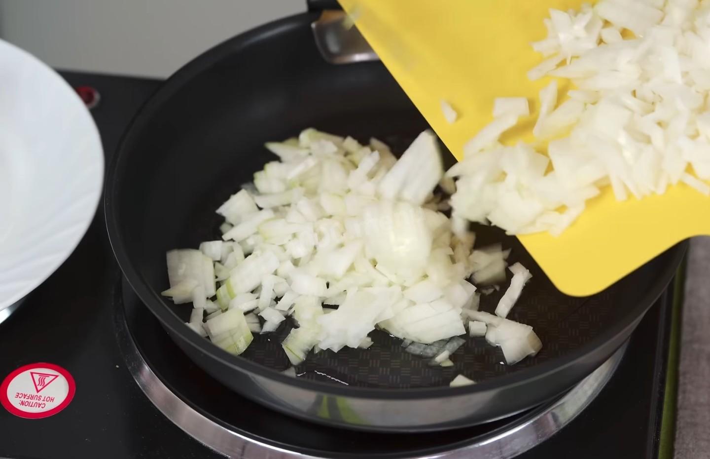 Возьмите сковороду и поставьте на плиту, после чего выливайте в нее три столовые ложки растительного масла и выкладывайте предварительно мелко нарезанные две небольшие головки репчатого лука, которые затем перемешивайте и обжаривайте на среднем огне плиты до золотистого цвета.