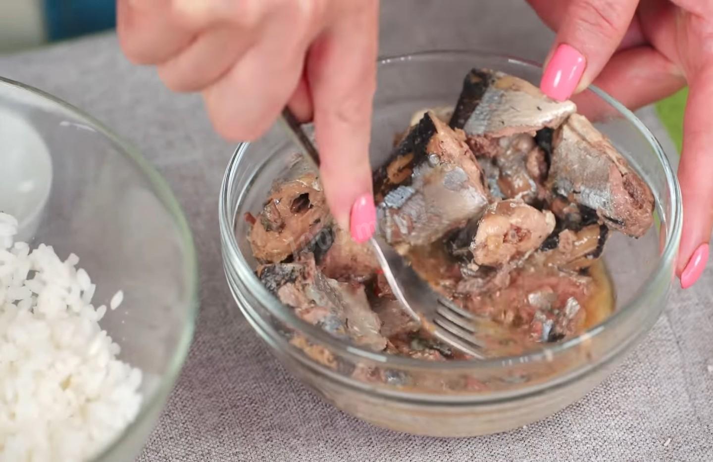 Возьмите небольшую миску и выкладывайте в нее порядка двести сорока граммов консервированной сайры, которую затем хорошо разминайте.