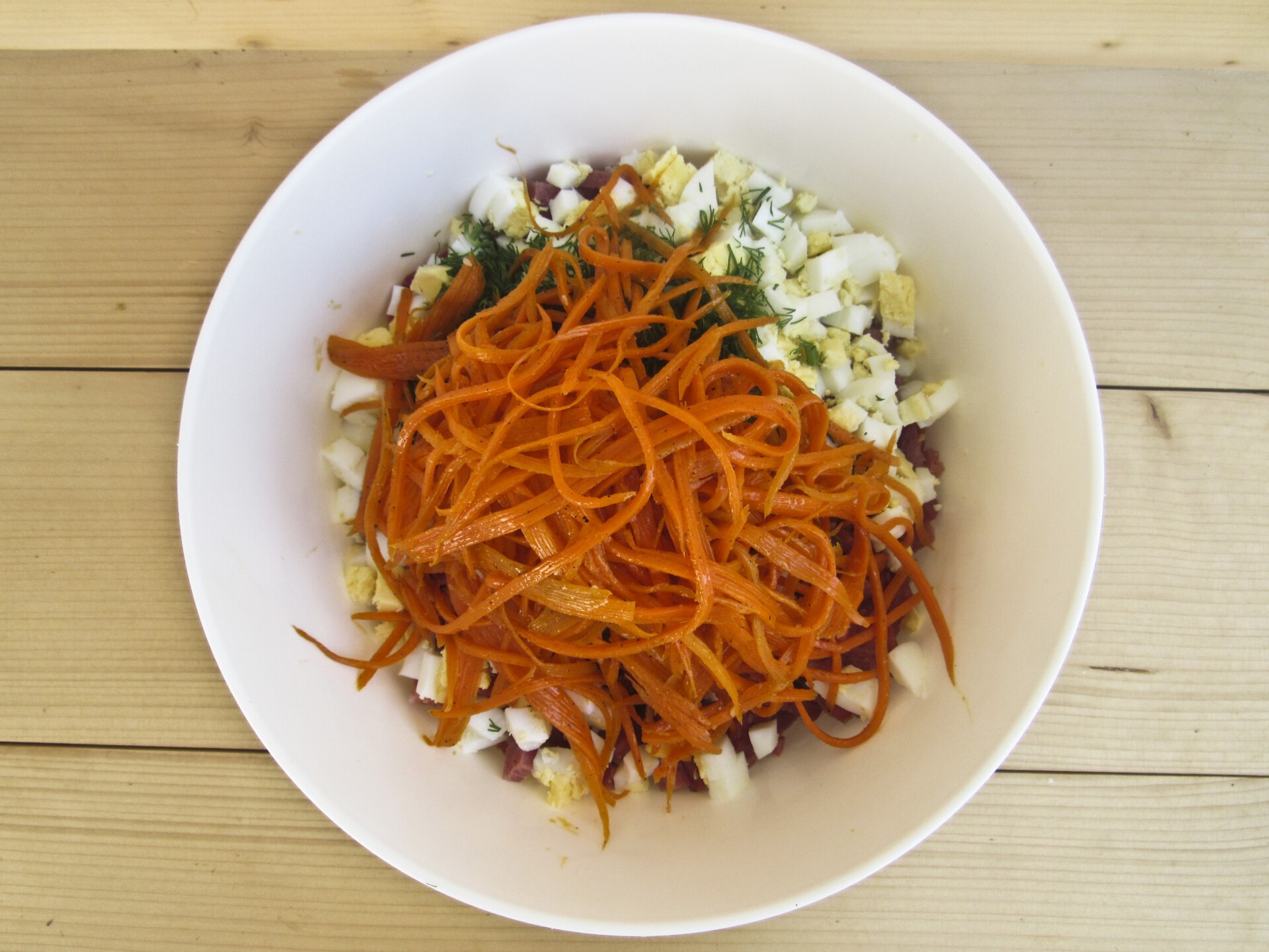 Ко всем ингредиентам в миску добавляем морковь по-корейски.