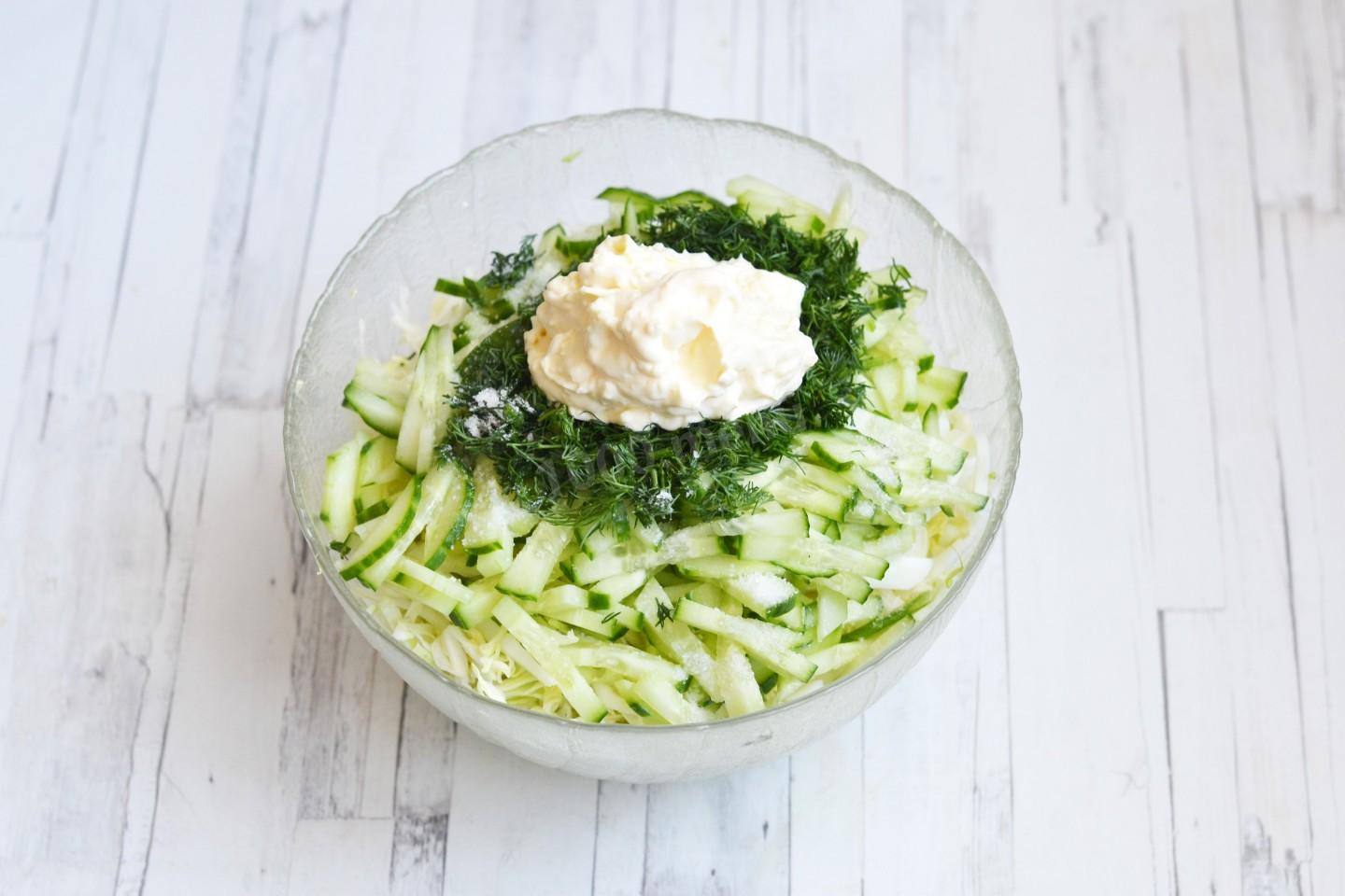 В миску с капустой выложите рубленые белки, огурцы, укроп и желтки с майонезом.