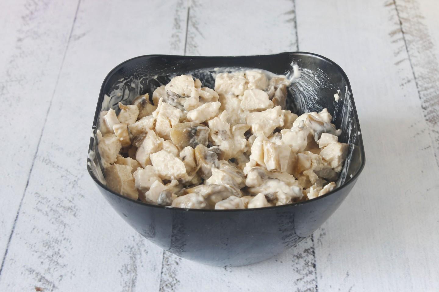 Переложите в миску нарезанное куриное филе и жареные грибы, добавьте майонез, перемешайте. Майонез можете брать любой, у меня домашний.