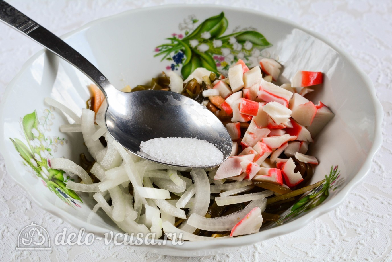 Ссылка на оригинал рецепта: Салат с морской капустой и крабовыми палочками на delo-vcusa.ru