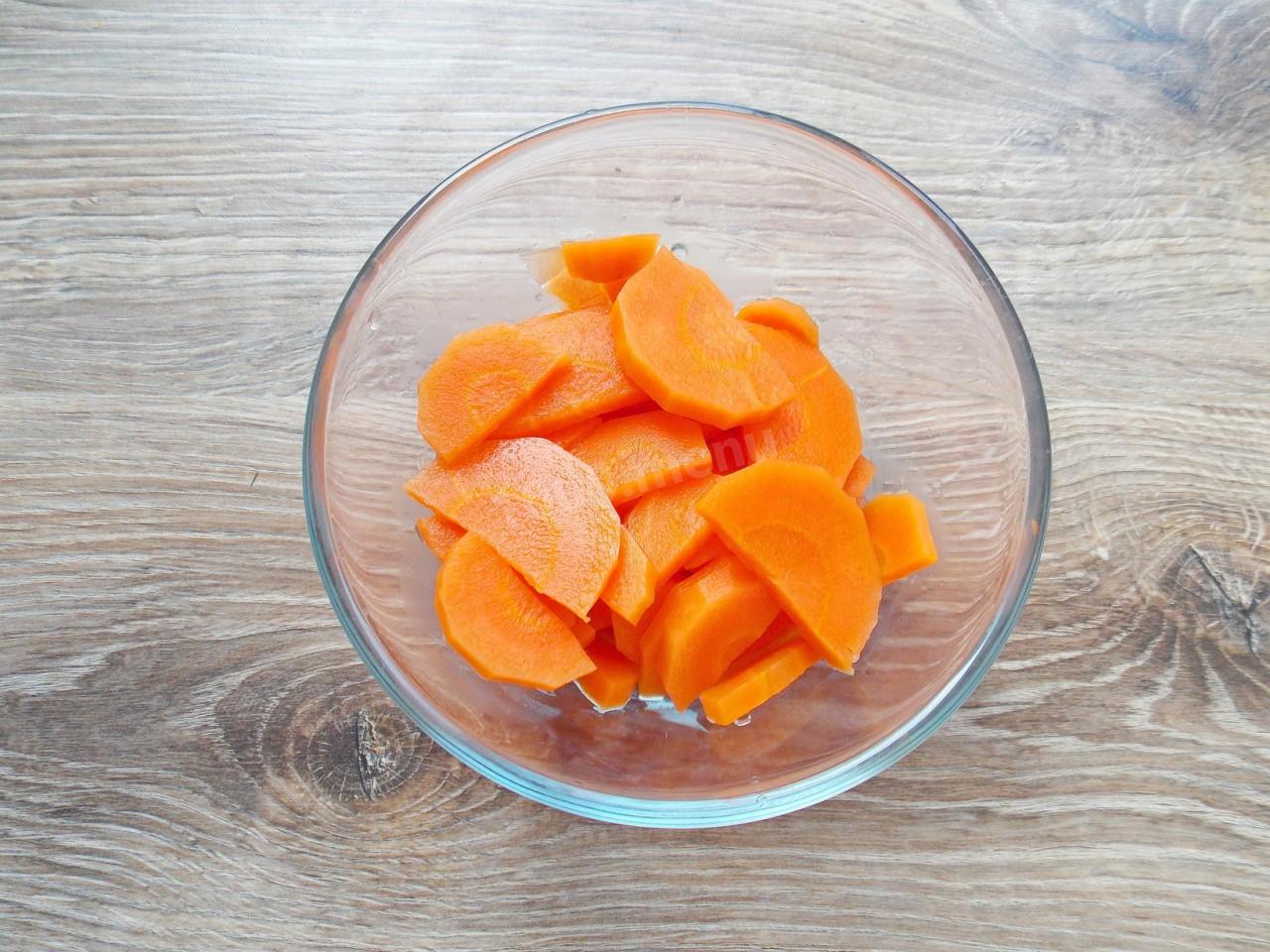 Снимите с огня, слейте отвар и сразу промойте холодной водой. Это нужно, чтобы морковь перестала вариться изнутри и не стала слишком мягкой. Дайте воде полностью стечь и переложите ее в миску.