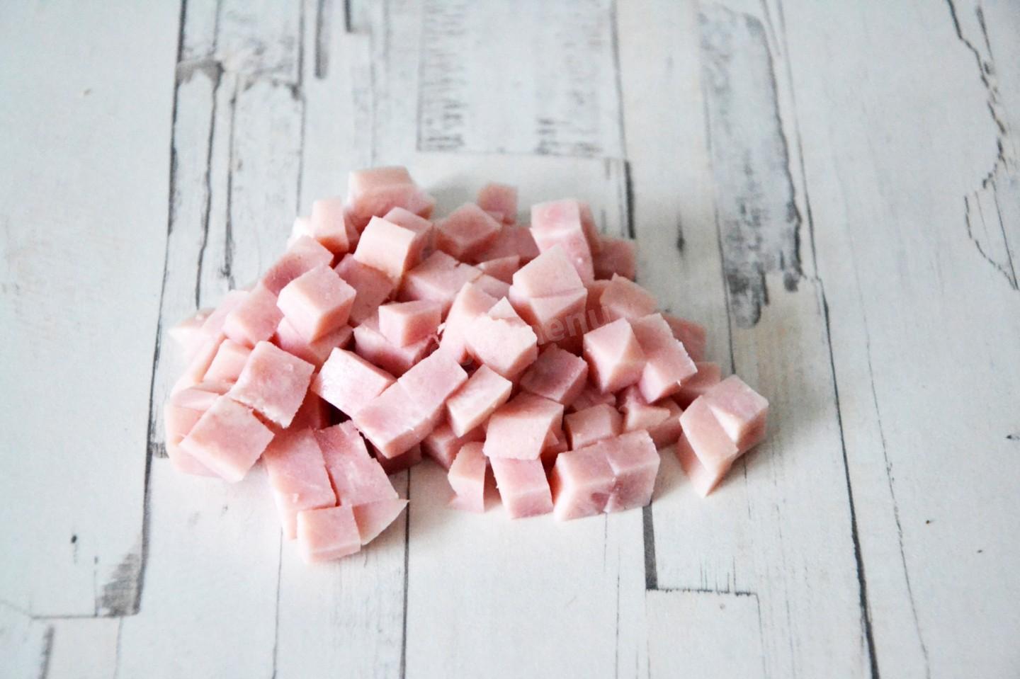 Ветчину нарежьте небольшими кубиками. Салат будет красиво и аккуратно смотреться, если нарезать все ингредиенты одинаковыми по размеру и форме кусочками. Готовьте салаты только из полностью охлажденных продуктов, так как приготовленный из тёплых, может быстро испортиться