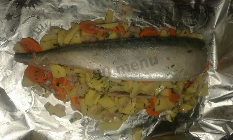 Скумбрия с картофелем луком морковкой и специями в фольге с фото