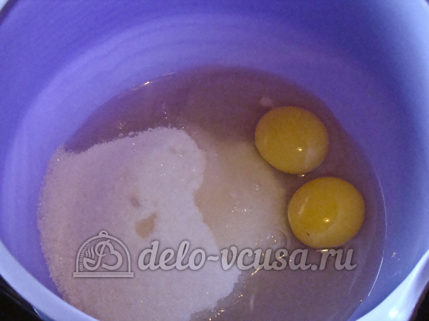Сначала займемся тестом. Соединим сахар с яйцами.