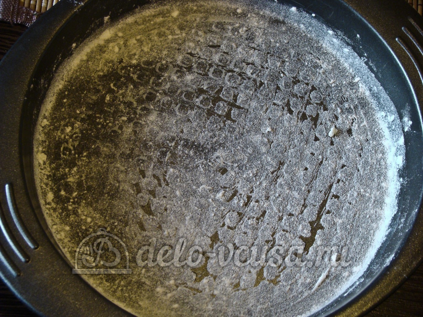 Форму для запекания сначала смазываем кусочком сливочного масла, а потом присыпаем мукой.