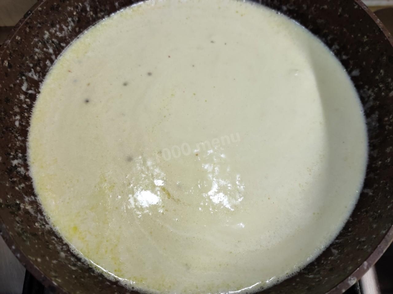 По частям влить в сковороду молоко. Посолить и поперчить соус по вкусу. Кипятить около пяти минут, периодически помешивая. Соус должен загустеть.