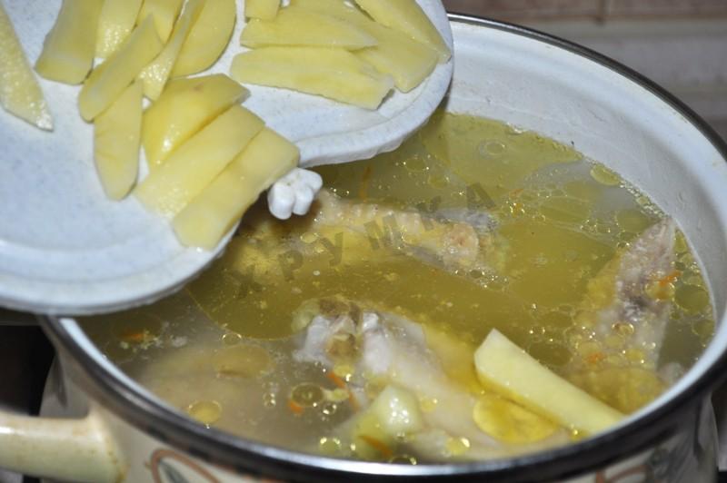 Когда куриное мясо сварится, добавляем в бульон картошку. Она довольно быстро сварится.
