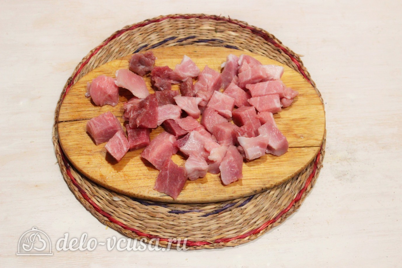 Для начала следует промыть кусок свежего мяса под струей проточной воды. Нарезаем его на некрупные куски и отправляем в воду вариться.Вы можете выбрать мясо на свой вкус. Если хотите, добавьте в бульон для навара еще и кость.