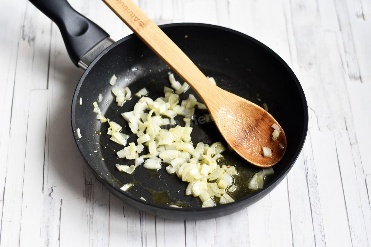 Далее разогрейте еще треть сливочного масла и обжарьте лук до прозрачности. Также переложите его в кастрюлю.