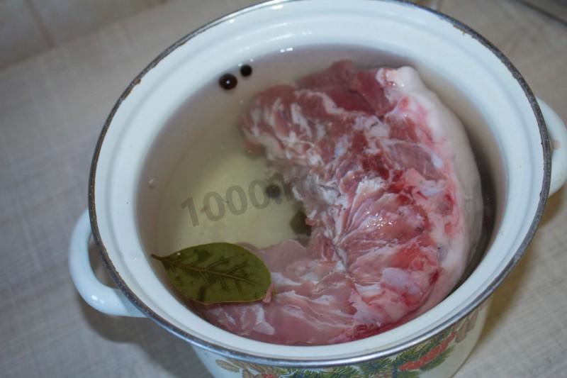 Для того, чтобы мясо хорошо просолилось и было сочным, мы будем вымачивать его в рассоле. Для этого в 1-1,5 л воды кладем лавровый лист и душистый перец