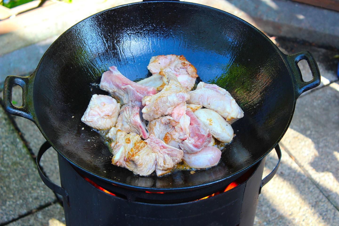 На сильном костре обжарьте до румяного оттенка. Посолите всё по вкусу. Далее влейте 50-100 мл воды, пламя под казаном сделайте минимальным, накройте казан крышкой и томите рёбрышки около 30 минут. Через время откройте крышку и проверьте, не пригорает ли мясо (если нужно, добавьте ещё немного воды).