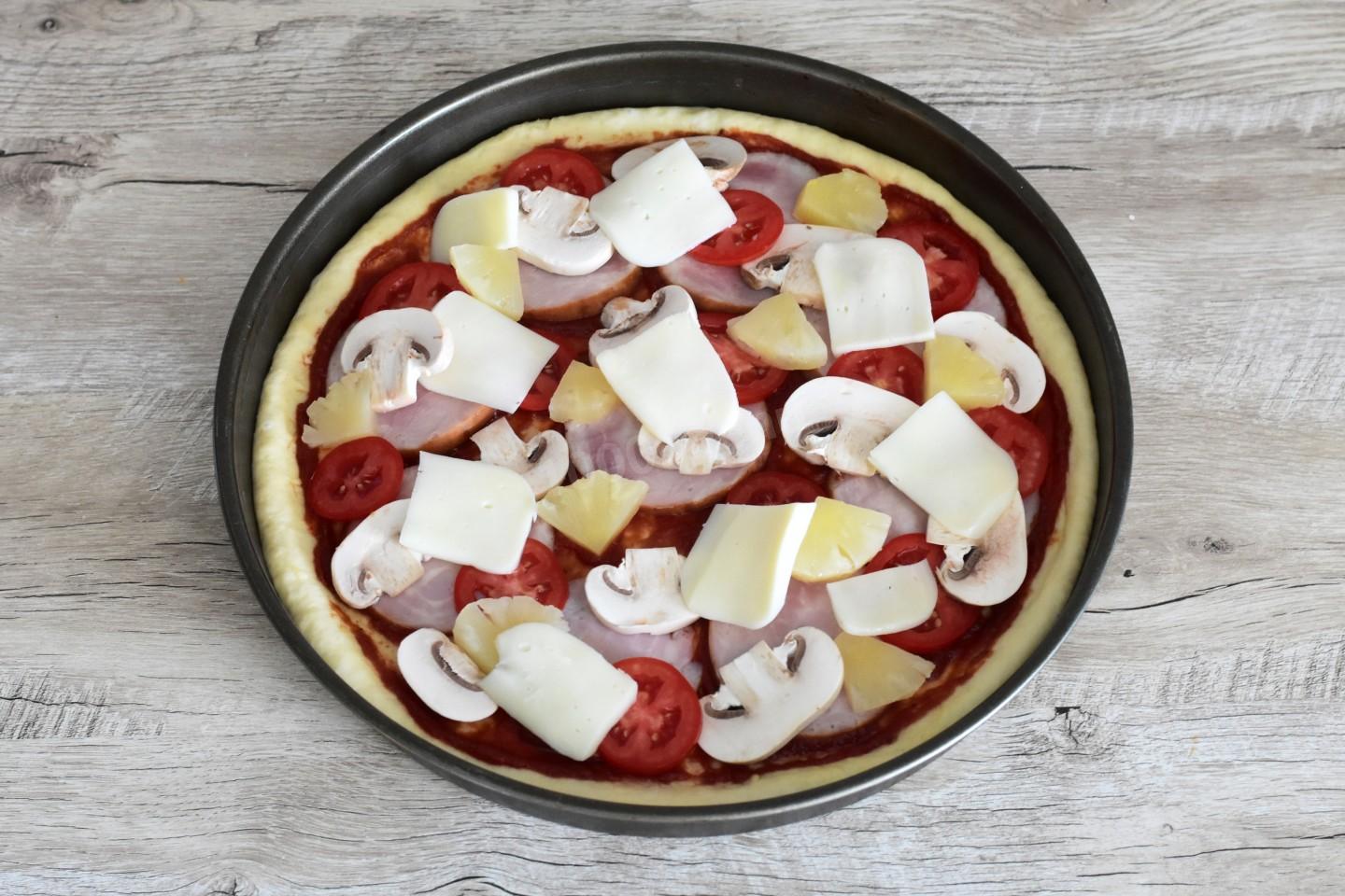 Поверх соуса распределите ветчину, грибы, помидоры и ананасы.
