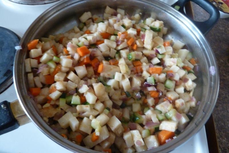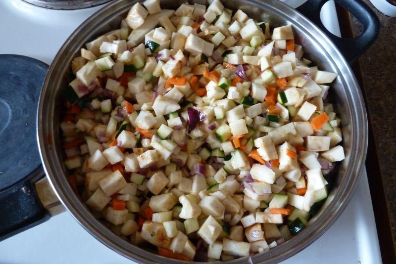 Морковь, лук, сельдерей и цуккини режем мелкими кубиками. Обжариваем овощи вместе с красным перцем и рубленым чесноком 10 минут.