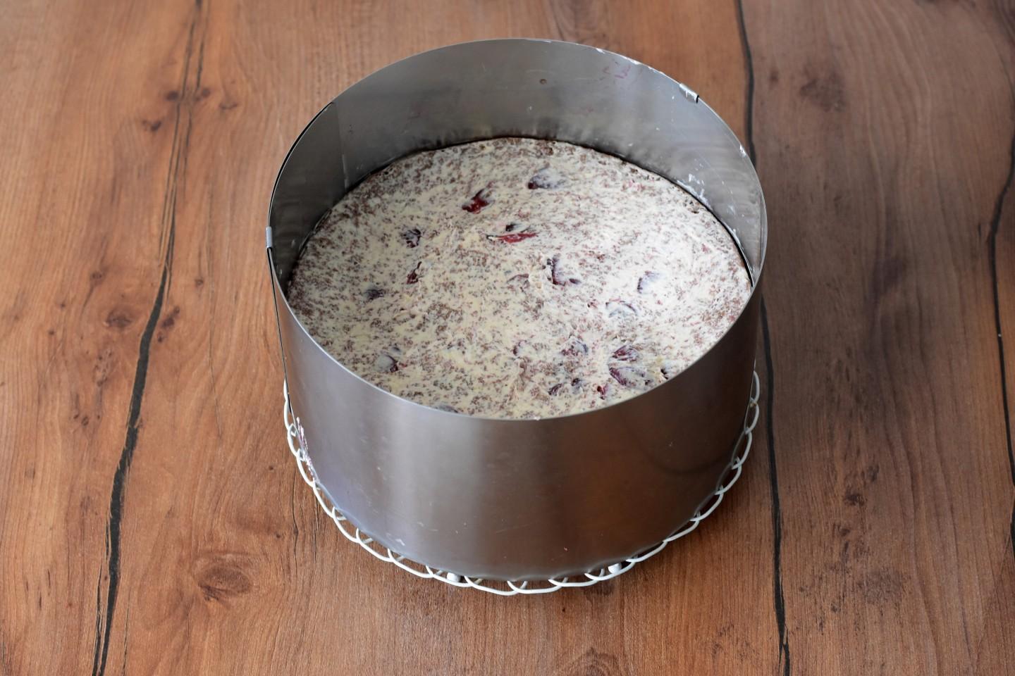 В кулинарное кольцо выложите нижний корж, пропитайте алкогольным сиропом от вишни.