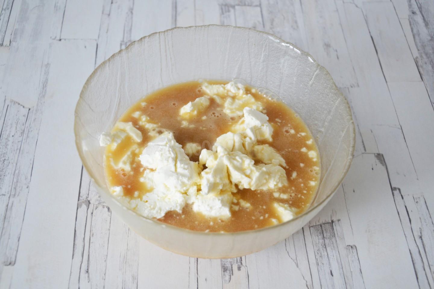 В глубокую миску выложите творожный сыр, влейте к нему сливочно-желатиновую массу.