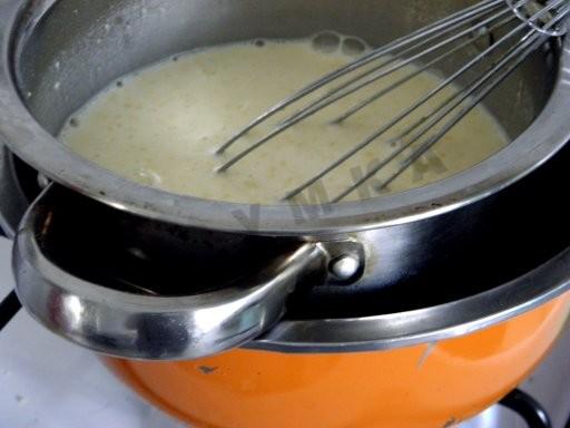Отправляем крем на водяную баню и варим до загустения, постоянно помешивая.